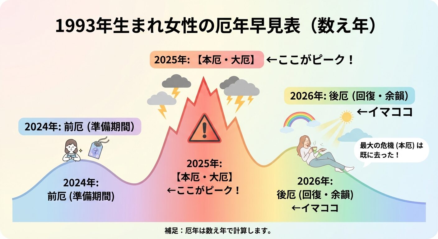 1993年(平成5年)生まれの女性にとって、人生最大級の注意が必要な「本厄(大厄)」は、実は2025年(数え年33歳)でした。