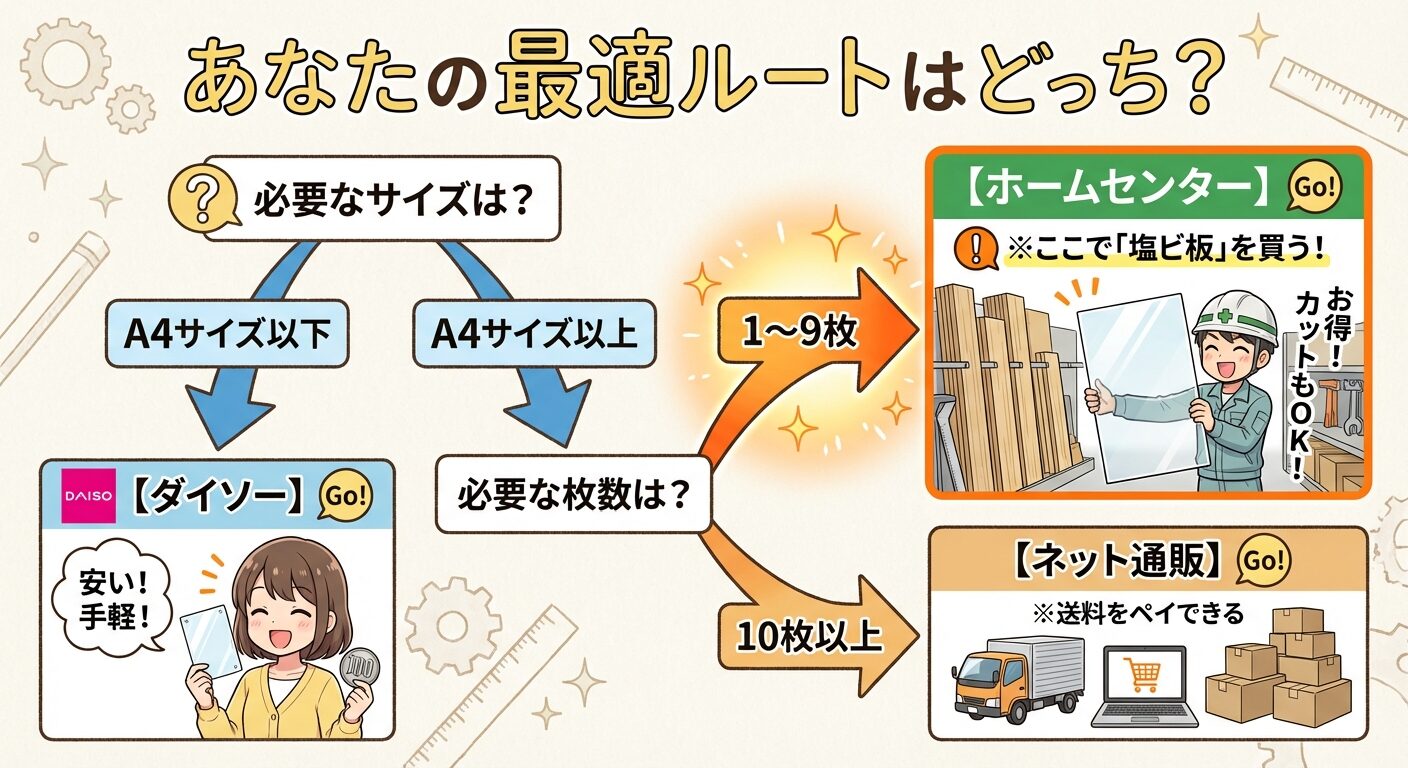 答えはシンプルです。「アクリル板」への固執を捨て、「塩ビ板(硬質塩化ビニル板)」を選んでください。