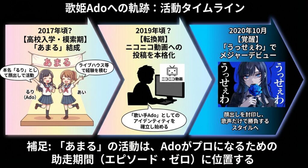 このように時系列で見ると、「あまる」としての活動は、Adoがメジャーデビューする前の「表現者としての土台を作っていた時期」であることがわかります。