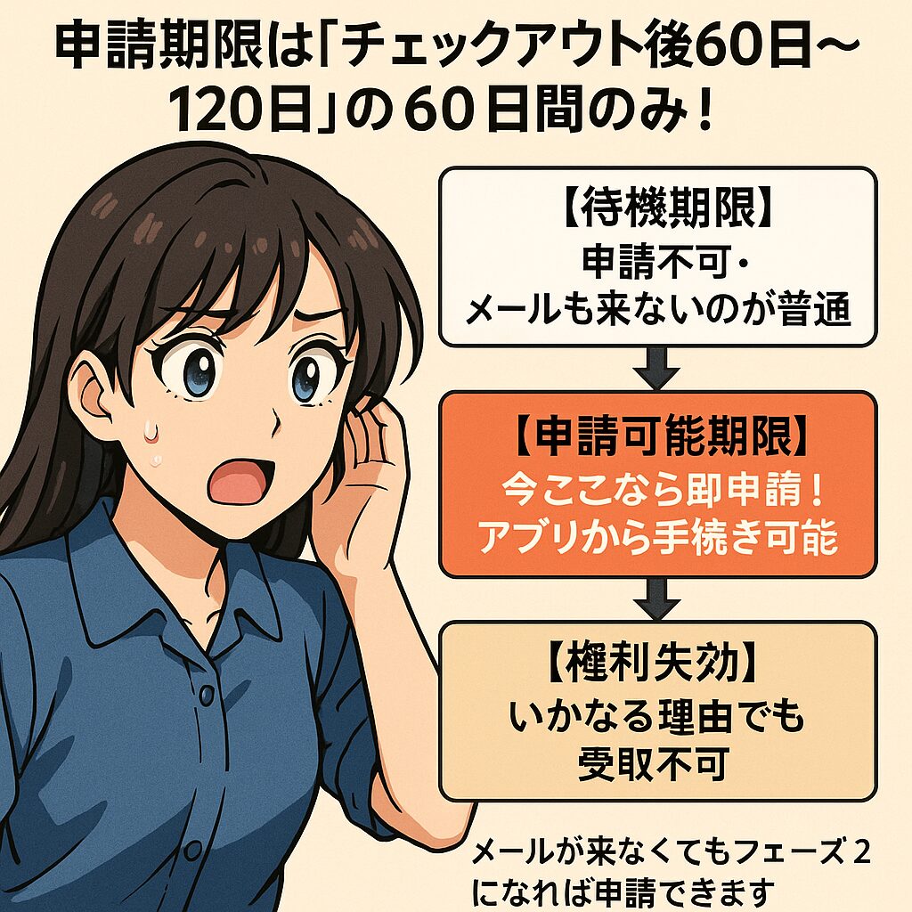 - 期限は絶対: チェックアウト後60日~120日の間しか申請できません。1日でも過ぎればアウトです。
