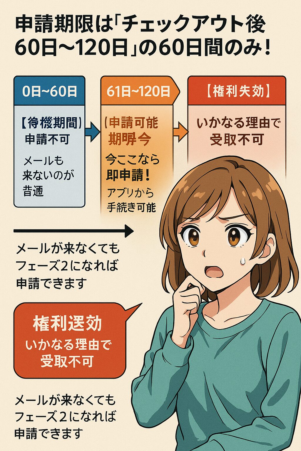 - 期限は絶対: チェックアウト後60日~120日の間しか申請できません。1日でも過ぎればアウトです。