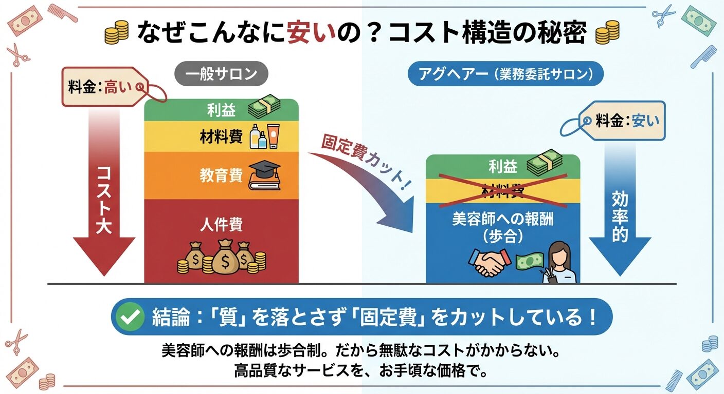 「安さには裏がある」。そう疑うのは賢い消費者の証です。しかし、アグヘアーの安さに「怪しい裏」はありません。あるのは、徹底的に計算された「企業努力」と「仕組み」だけです。