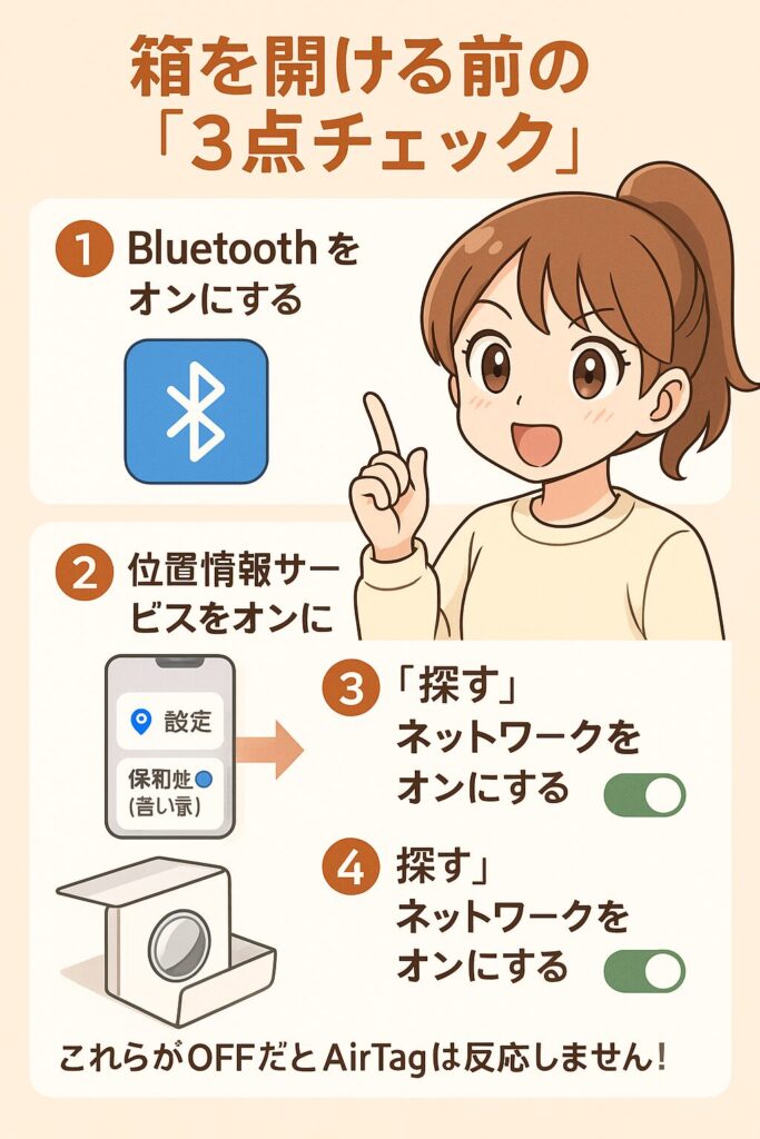 - 設定前: Bluetooth、位置情報、探す機能をONにする