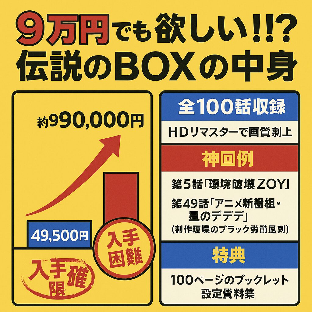 「環境破壊ZOY」だけじゃない。全100話すべてが、現代社会への鋭いメッセージを含んでいる。それを最高画質で手元に置ける権利に、9万円は決して高くない……と、私は自分に言い聞かせている。
