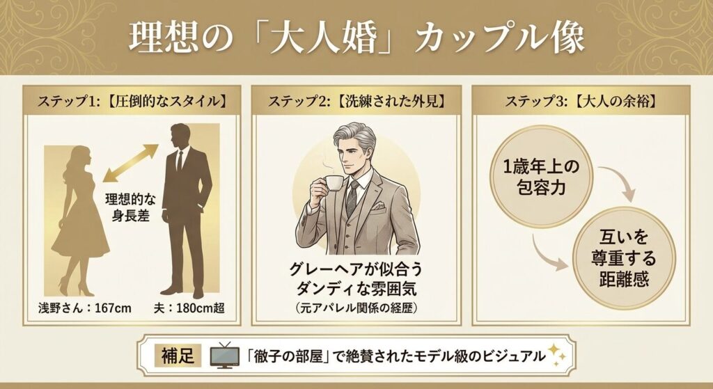 具体的には、浅野ゆう子さんの夫は1歳年上の一般男性であり、身長は180cmを超える長身です。浅野ゆう子さん自身も167cmと女性としては高身長ですが、二人が並んだ姿は非常にバランスが良く、まさに「美男美女」という言葉が相応しいカップルです。