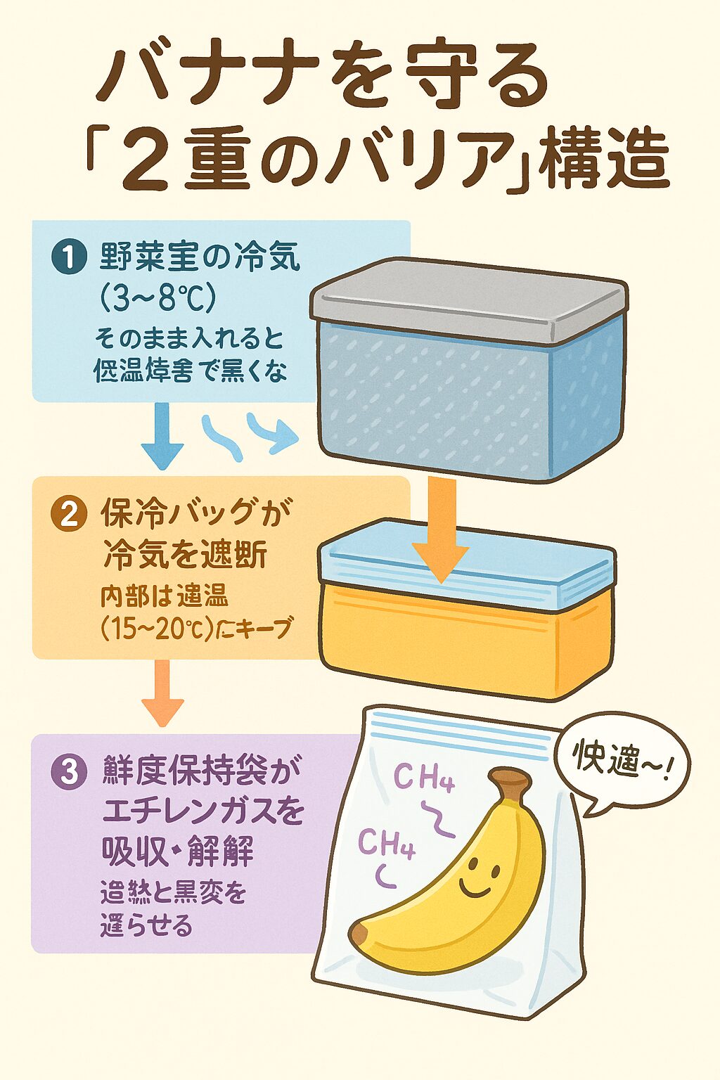 保冷バッグは、外からの熱を遮断するだけでなく、冷気の侵入も防ぎます。野菜室の中に保冷バッグを置くことで、保冷バッグが野菜室の強い冷気を遮断し、バッグ内部をバナナにとって快適な15℃?20℃付近に保つことができます。 まさにバナナにダウンコートを着せるようなものです。 - 鮮度保持袋とエチレンガスの関係(抑制・分解):