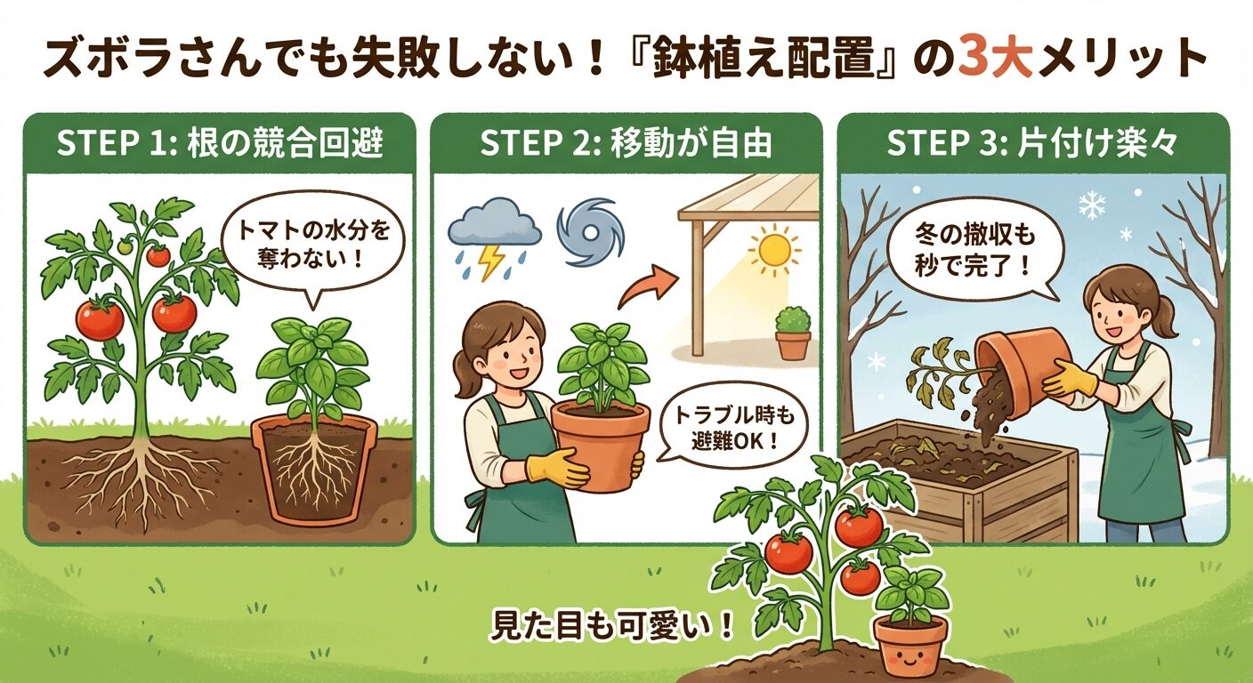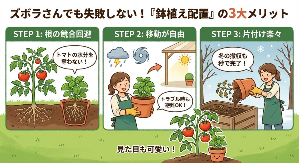 - 「鉢植え配置」なら、巨大化も防げて、トマトとの共存も完璧です。