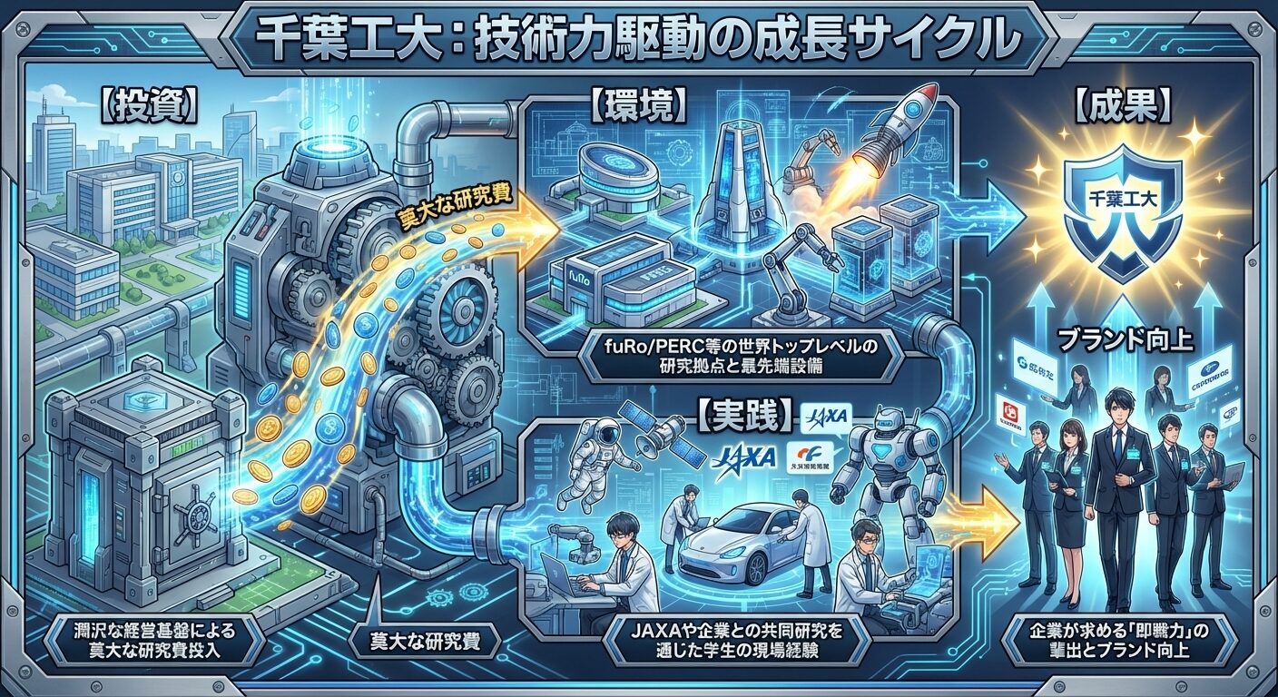 fuRoやPERCといった世界レベルの研究組織は、千葉工大のブランド価値を象徴するエンティティです。 莫大な研究費を投じて最先端設備を整え、そこへ一流の研究者を配する。このエコシステムが、学生に「本物の現場」を経験させる最高の教育環境を生み出しています。