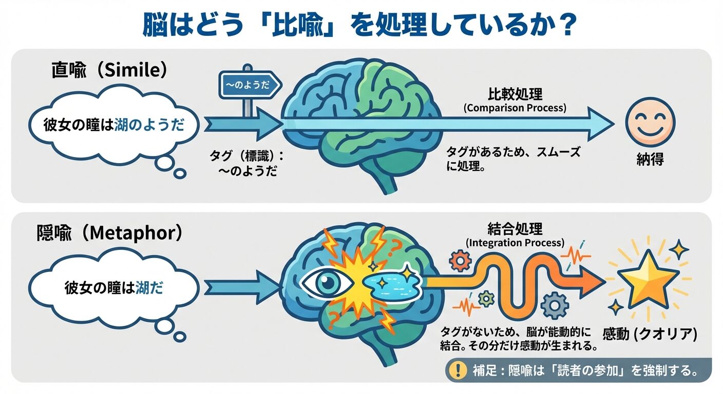 「比喩標識」がないことで発生するこの能動的な「謎解き(意味の結合)」のプロセスこそが、読者の脳内に強い「クオリア(質感)」を生み出します。