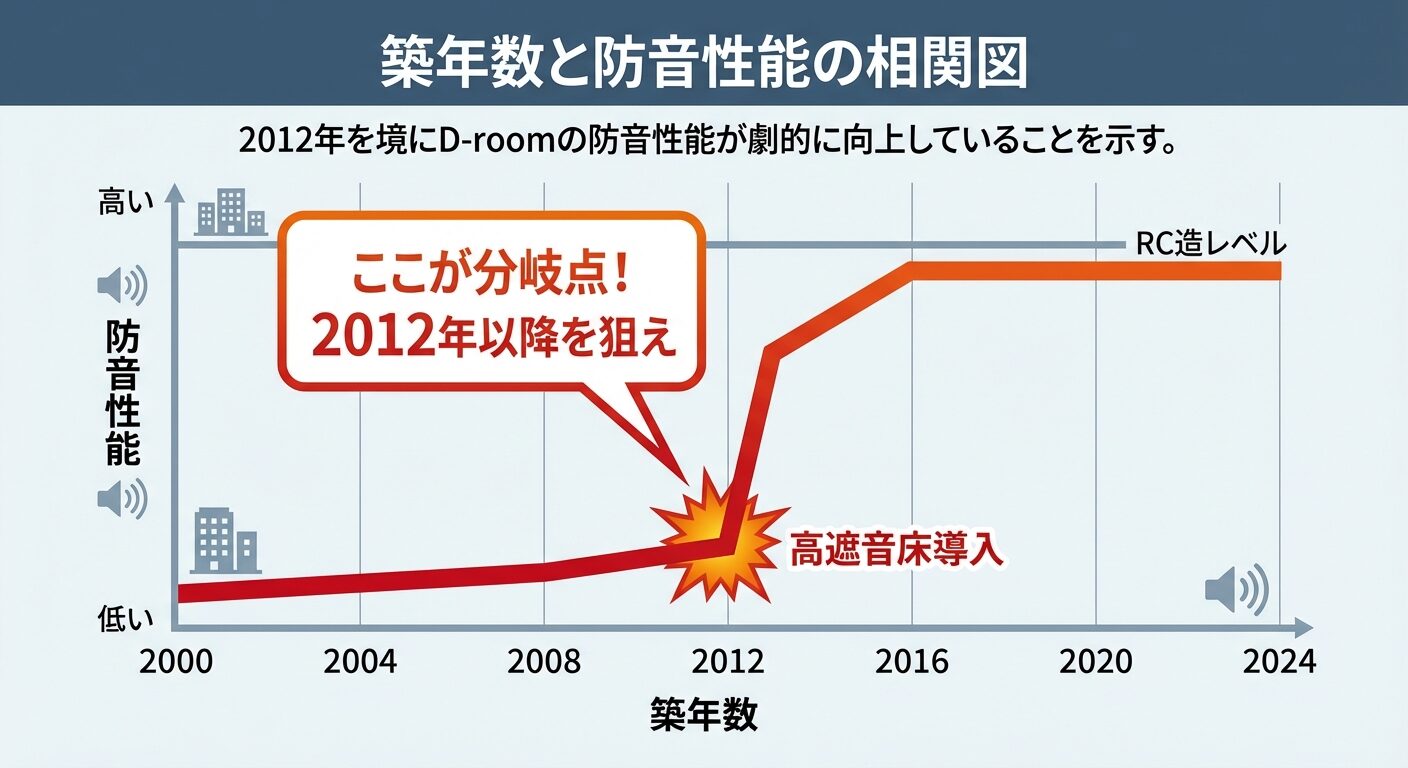 この頃から、高遮音床などの新技術が標準的に採用され始めました。つまり、2012年以降に建てられた物件であれば、それ以前の物件とは別次元の防音性能を持っている可能性が高いのです。