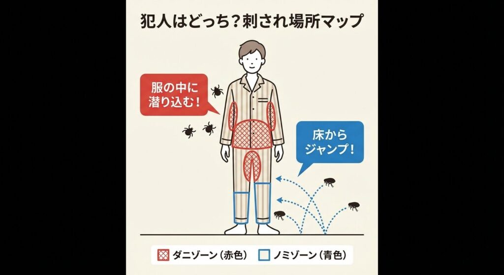 痒くて辛いですよね。でも、慌ててバルサンを焚く前に、まずはその「刺された場所」を見てください。