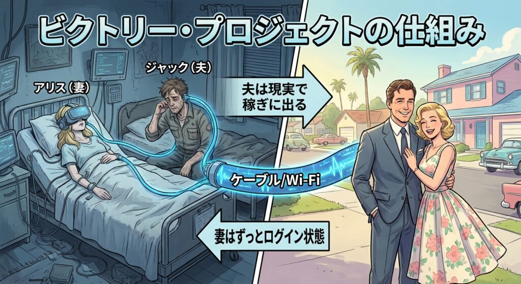 ここが最も恐ろしいポイントです。夫たちは、現実世界で妻をベッドに拘束し、点滴で栄養を送りながら、強制的にヘッドセットを装着させて仮想世界にログインさせていたのです。