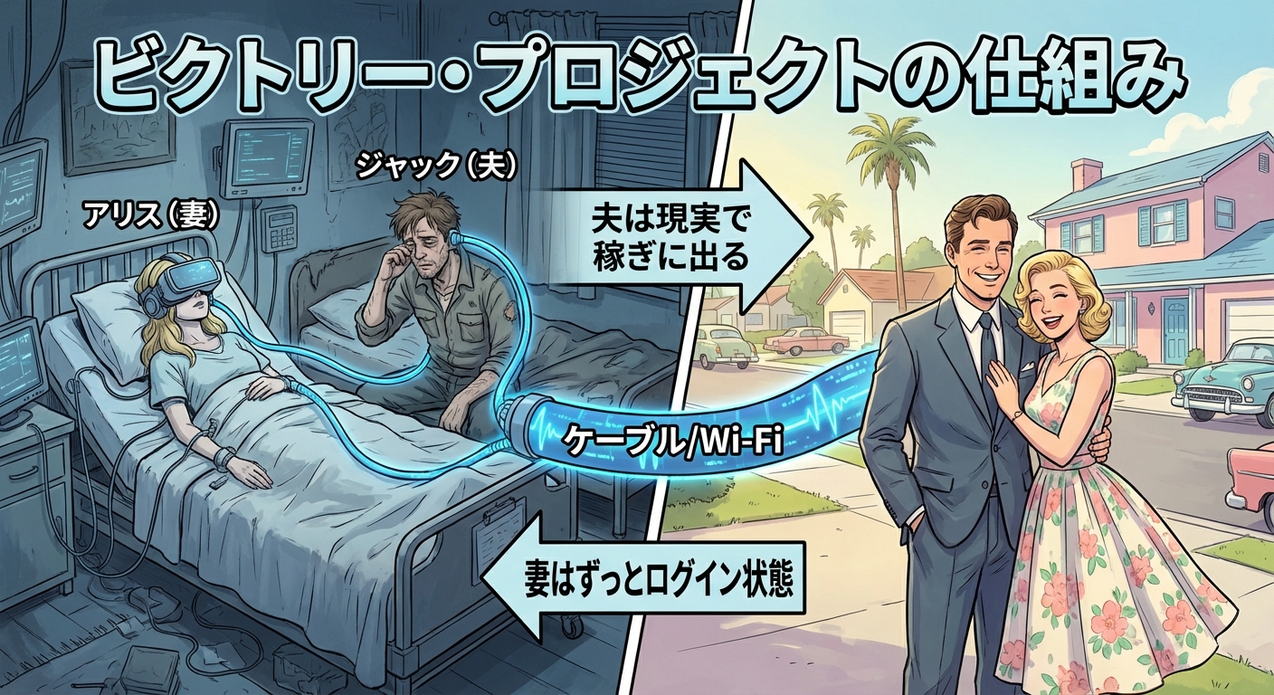 夫たちが毎朝「仕事」に行くと言ってビクトリーの街を出ていくのは、実は現実世界でログアウトし、肉体労働などをして仮想空間の維持費(参加費)を稼ぐためでした。彼らにとっての「現実」は、妻を支配できる仮想空間の方だったのです。