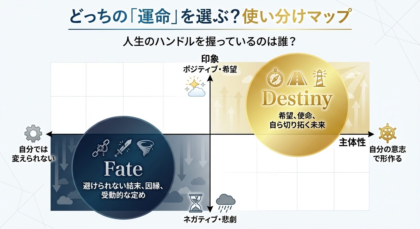 どちらも日本語では「運命」と訳されているけれど、「私の今の『前向きな決意』をSNSで発信するには、どっちの単語が正解なの?」……そんな風に、スマートフォンの前で指を止めて迷っていませんか?