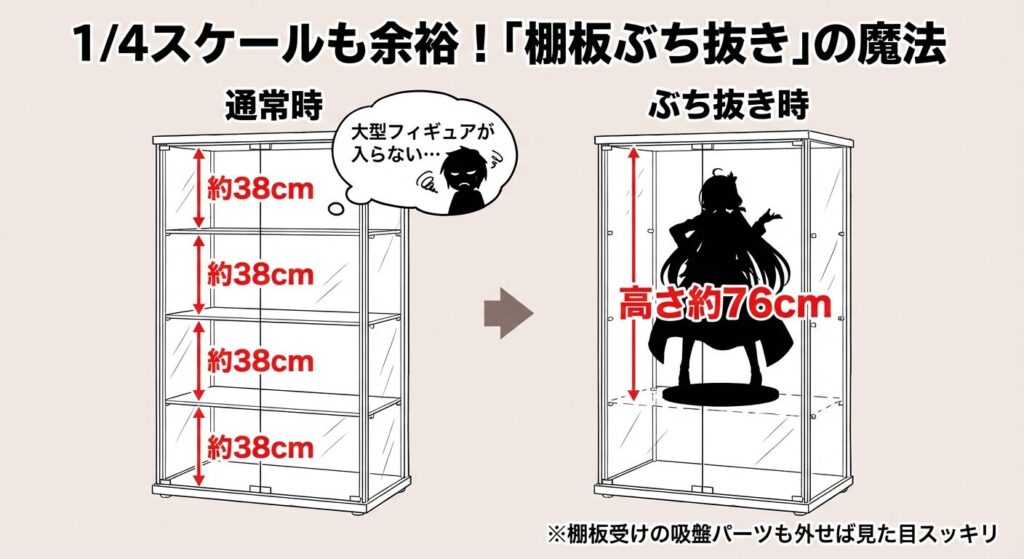 そう思ったあなた、鋭いです。確かに、標準仕様のままでは内寸の高さが約38cmしかなく、1/4スケールや高さのあるスタチューは入りません。しかし、ここで「棚板ぶち抜き」という機能拡張を行います。