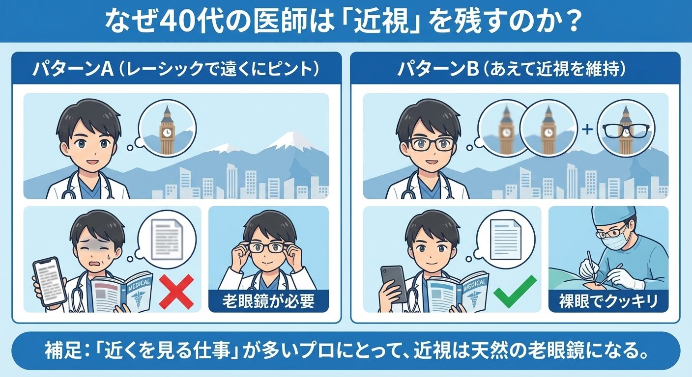 H2-2: なぜ執刀医はメガネを外さないのか?プロが「あえて近視を残す」3つの合理的理由