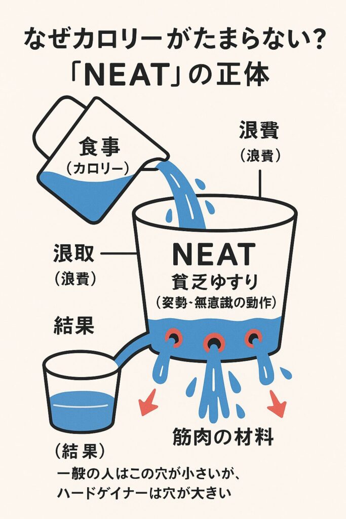 ハードゲイナーとNEATの関係は非常に密接です。NEATとは、貧乏ゆすりや姿勢の維持、会話中の身振り手振りなど、運動以外の無意識の活動によるエネルギー消費のことです。僕たちハードゲイナーは、無意識のうちに常に体を動かしてしまっており、せっかく摂取したカロリーを、まるで穴の空いたバケツのように浪費してしまっているのです。