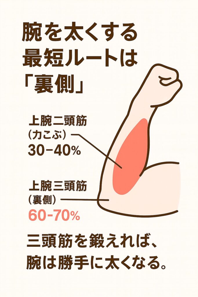 解剖学的に見ると、上腕三頭筋(二の腕の裏側)と腕の太さの関係は決定的です。実は、腕の筋肉の体積の約3分の2は上腕三頭筋が占めています。つまり、力こぶ(二頭筋)を必死に鍛えるよりも、裏側の三頭筋を鍛えたほうが、2倍の効率で腕を太く見せることができるのです。