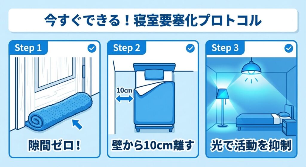濡れタオルで隙間を塞ぎ、ベッドを壁から離し、明かりをつけた今のあなたの寝室は、物理的にも生態学的にも「アイツが最も入りたくない場所」になっています。