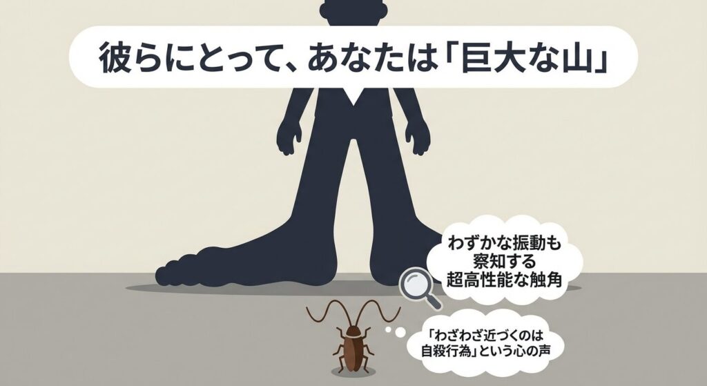 まず知っておいてほしいのは、ゴキブリにとって人間は「進撃の巨人」のような巨大な捕食者であるという事実です。彼らは非常に臆病で、自分より数万倍大きい生き物に自ら近づくメリットは一つもありません。