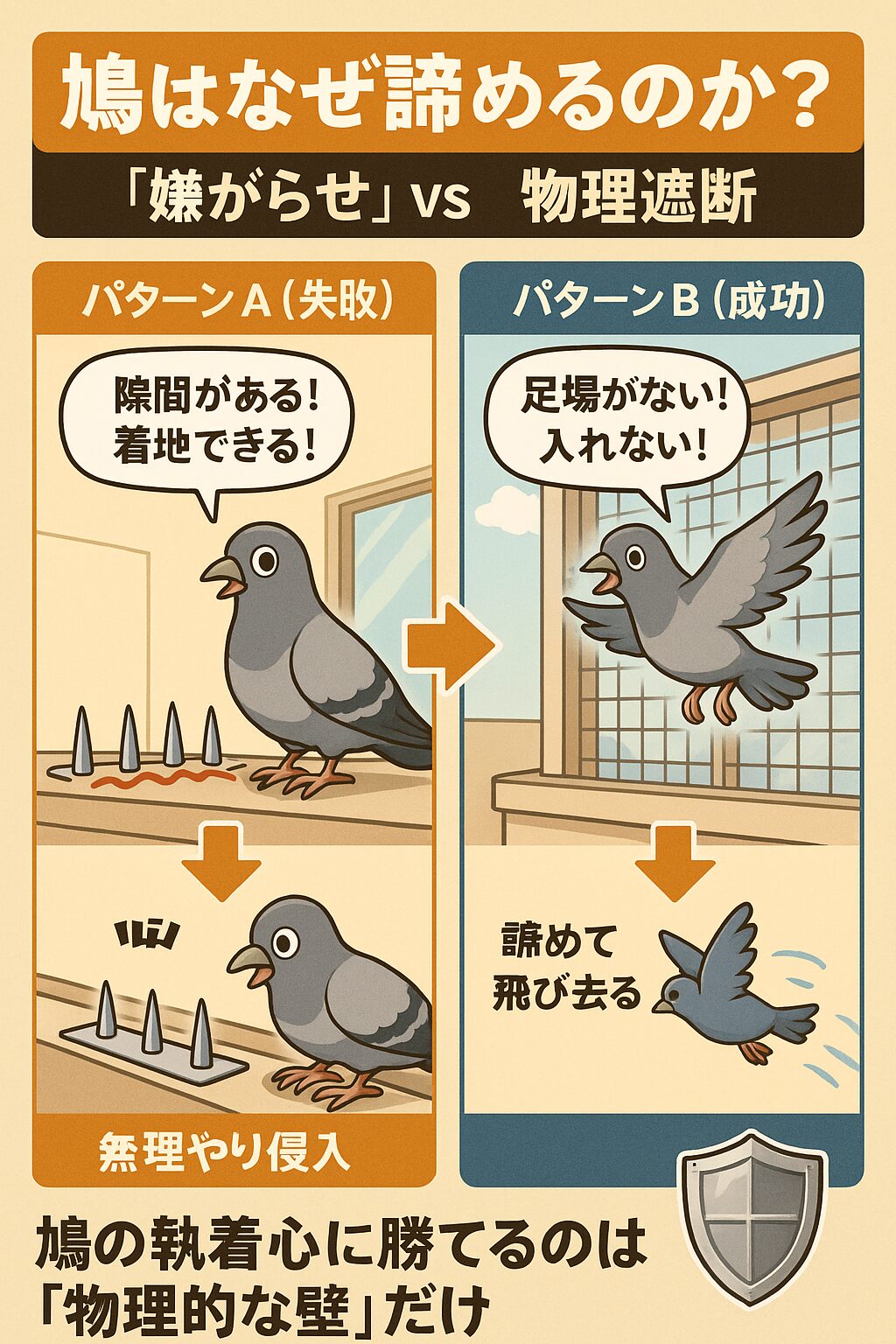 つまり、「スパイク(剣山)」のような「点」の対策では、鳩の強い「帰巣本能」に負け、いずれ突破されてしまうのです。 これが、手軽なグッズが失敗する根本的な原因です。