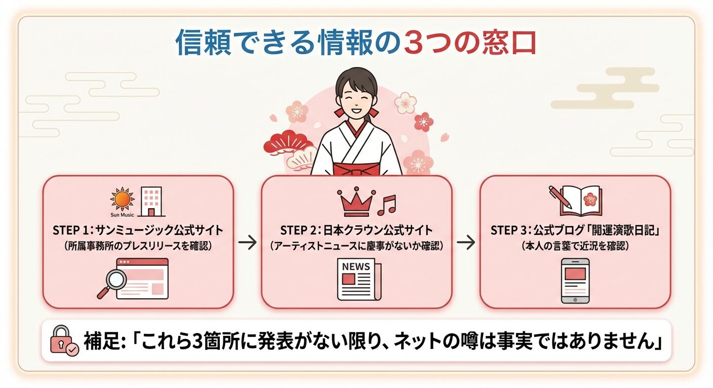 この記事では、演歌業界に20年携わってきた私たちが、所属事務所「サンミュージック」やレコード会社「日本クラウン」の最新情報を徹底調査しました。ネット上の不確かな噂に惑わされず、佐藤さんのような熱心なファンの方が安心して応援を続けられるよう、誠実な事実をお届けします。