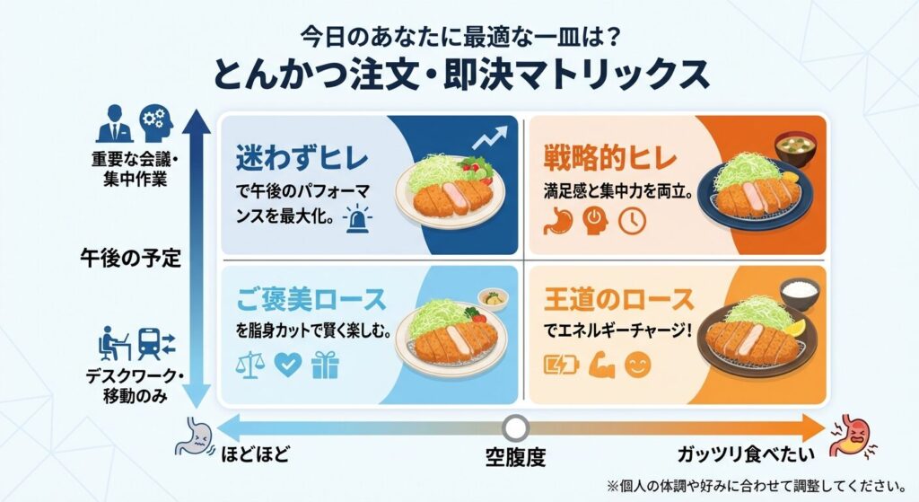メニューを前に迷っている佐藤さん、その葛藤、よくわかります。実は、ロースとヒレの選択は、単なる好みの問題ではなく「今日のあなたの午後のパフォーマンス」を決める戦略的な意思決定なんです。