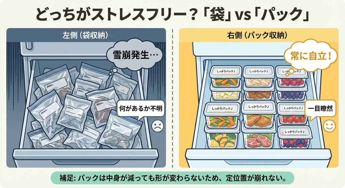 「あ、豚肉があるから今日は生姜焼きにしよう」と献立がすぐに決まり、買い物に行く回数が減ります。使いかけの野菜を腐らせて捨てる罪悪感からも解放されます。何より、整然と並んだパックを見るたびに、「私、ちゃんとできてる!」という自信が湧いてくるんです。