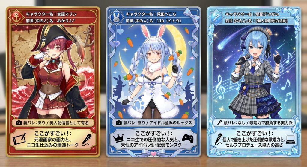 ここからは、実際に人気メンバーの「中の人」がどのような人物で、前世でどんな伝説を残してきたのかを紹介します。彼女たちの現在の魅力が、決して一朝一夕で作られたものではないことがわかるはずです。