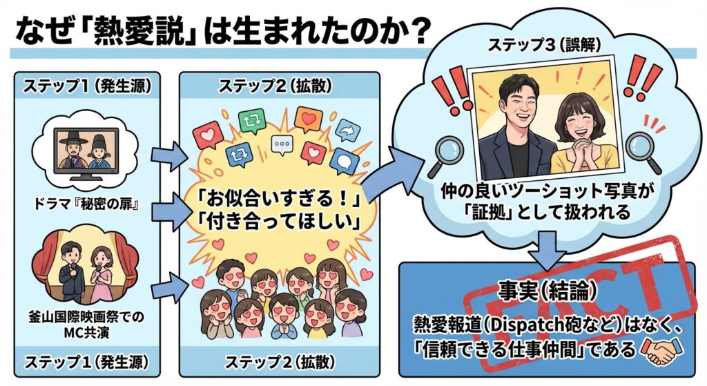 ネット上の噂は、あくまで「お似合いだから付き合ってほしい」というファンの願望や、仲の良い様子を切り取った画像から生まれたものです。