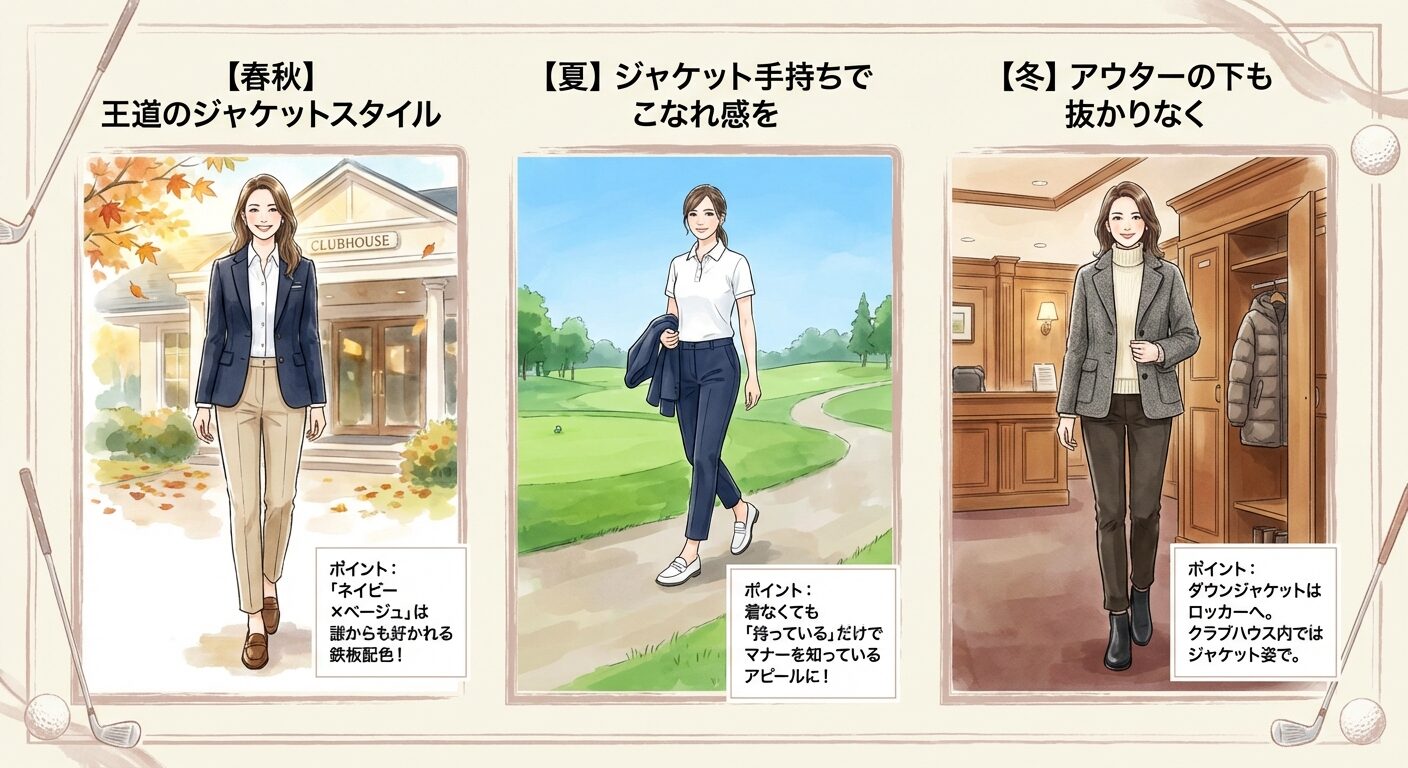 【画像あり】ゴルフ場の服装。名門コースで「マナー完璧な女性」と褒められる、行き帰りの「正解ジャケットコーデ」はこれだ!