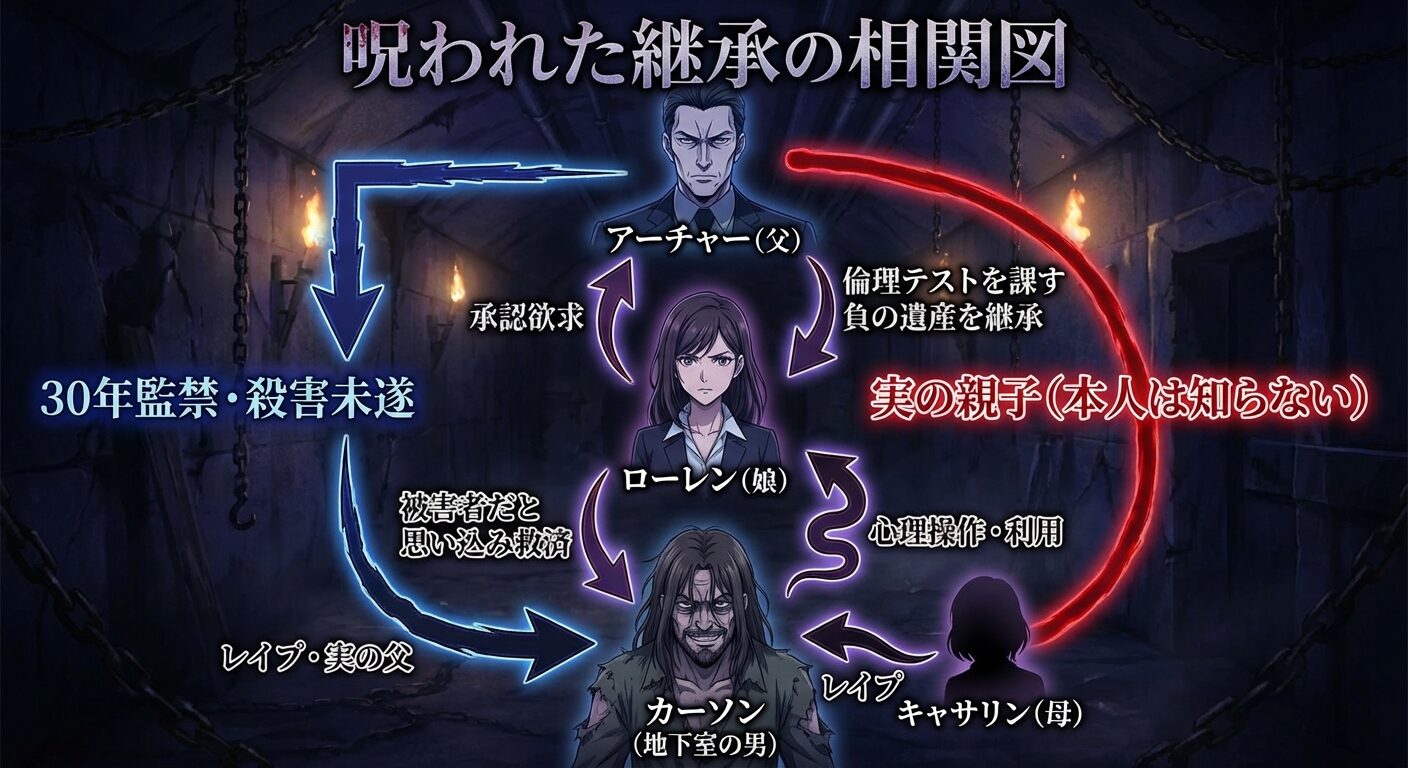 もしローレンが「法」を選べば、アーチャー自身の監禁罪も暴かれ、家の名誉は地に落ちます。しかし、もし彼女が「血(家族の秘密を守ること)」を選べば、彼女はアーチャーと同じ「共犯者」となり、モンロー家の闇を継承することになります。父は死してなお、娘を支配しようとしたのです。