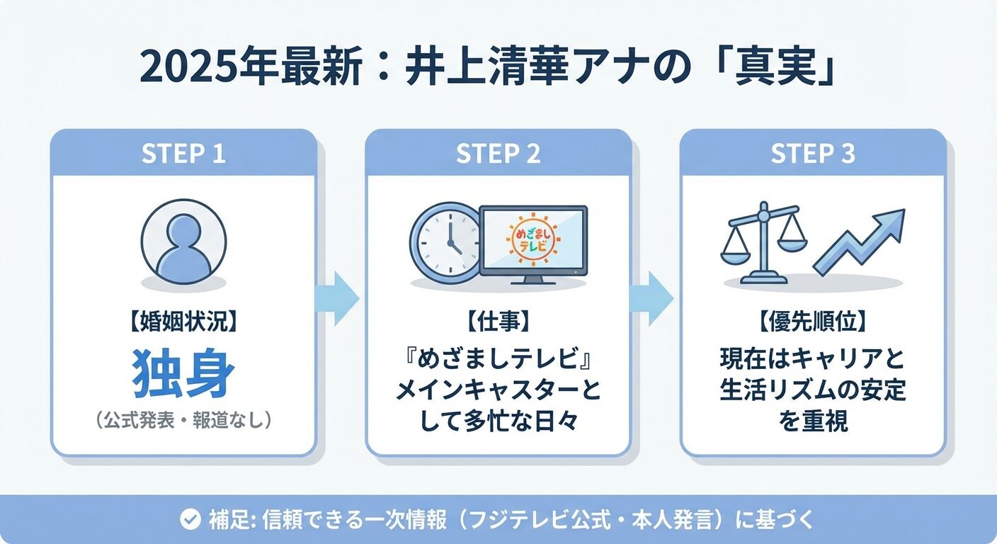 井上清華アナと結婚相手という関係性は、2025年現在において「存在しない」というのが、取材に基づく正確な答えです。