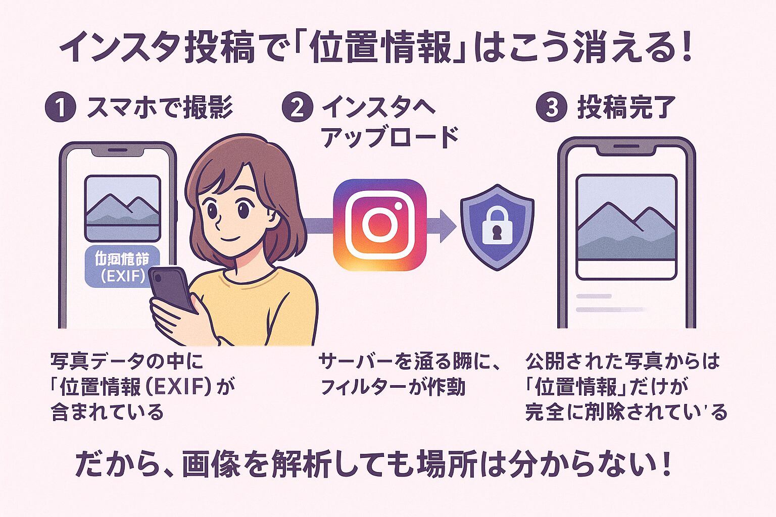 つまり、あなたがインスタで見ている画像は、位置データがきれいに洗い流された状態なのです。