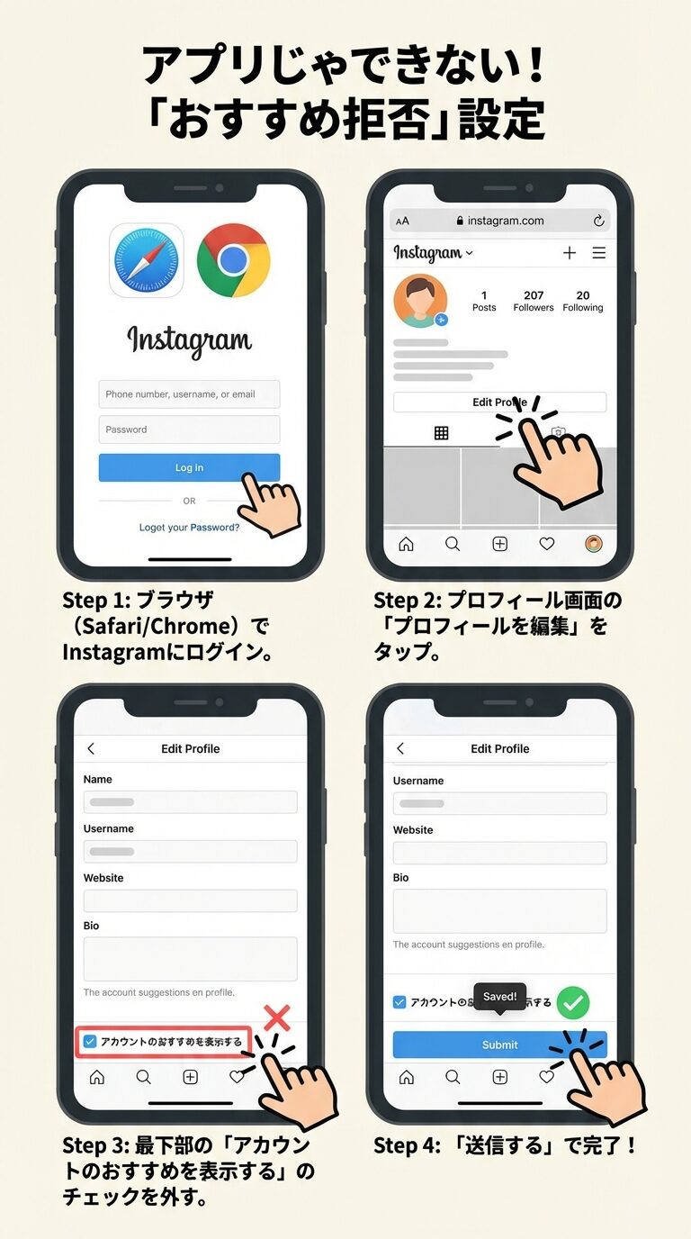 ここからは、スマホを使ってブラウザ版Instagramにアクセスし、あなたのアカウントを誰のおすすめにも表示させない「鉄壁の設定」を行う手順を解説します。