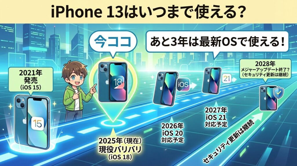 2021年発売のiPhone 13は、計算上2027年秋リリースの「iOS 21」まではサポートされる可能性が極めて高いです。さらに、セキュリティ更新のみであれば2029〜2030年頃まで続くでしょう。