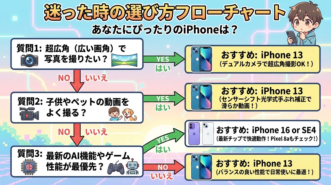 「AIはいらない、実用性が欲しい」。そう割り切れるあなたにとって、iPhone 13は最も賢い選択肢になります。