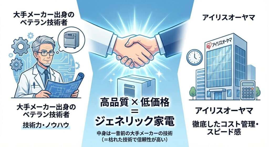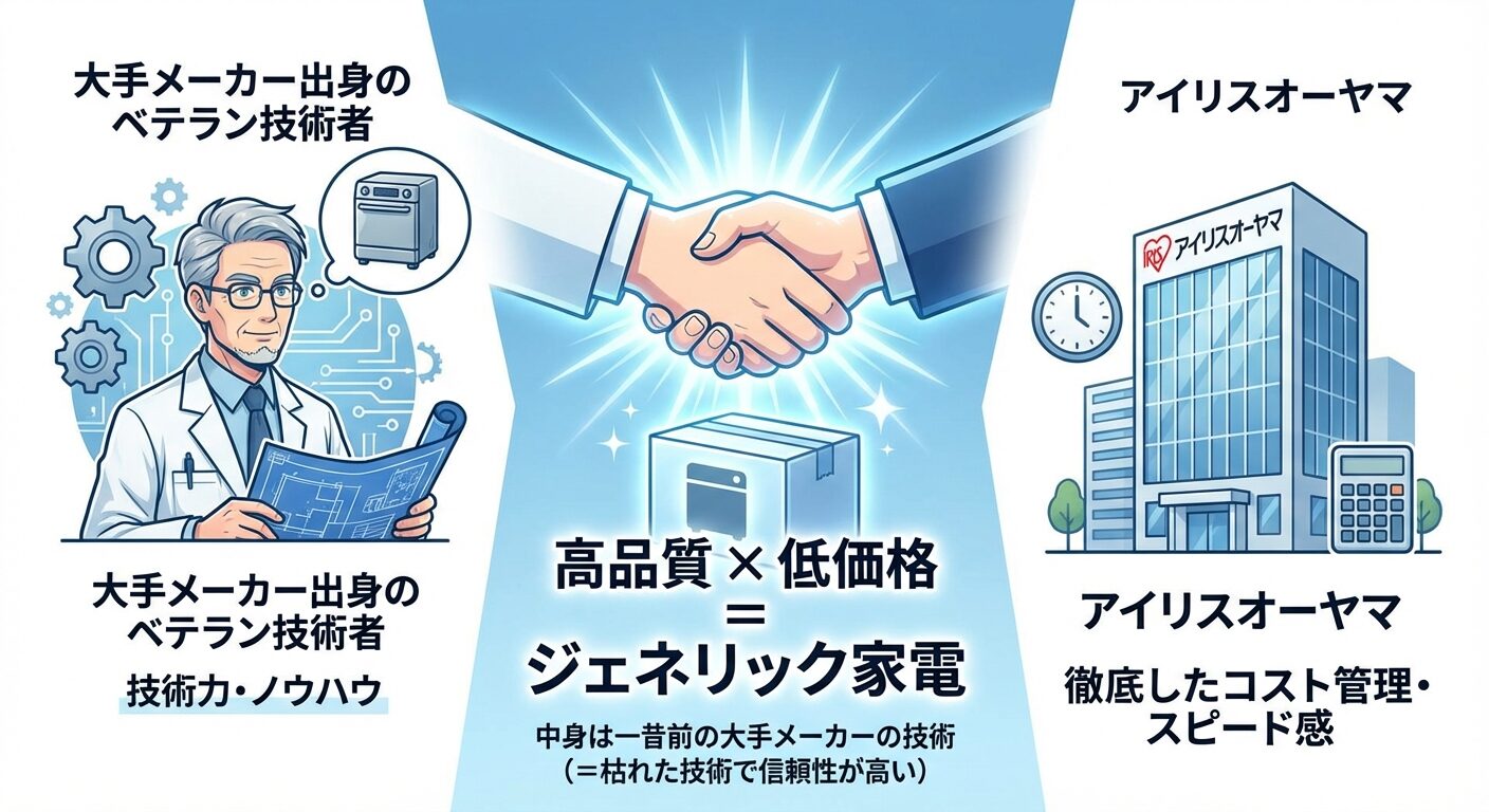 実は、アイリスオーヤマの家電開発部門には、パナソニックやシャープ、東芝といった大手電機メーカーを早期退職したベテラン技術者たちが大量に在籍しています。