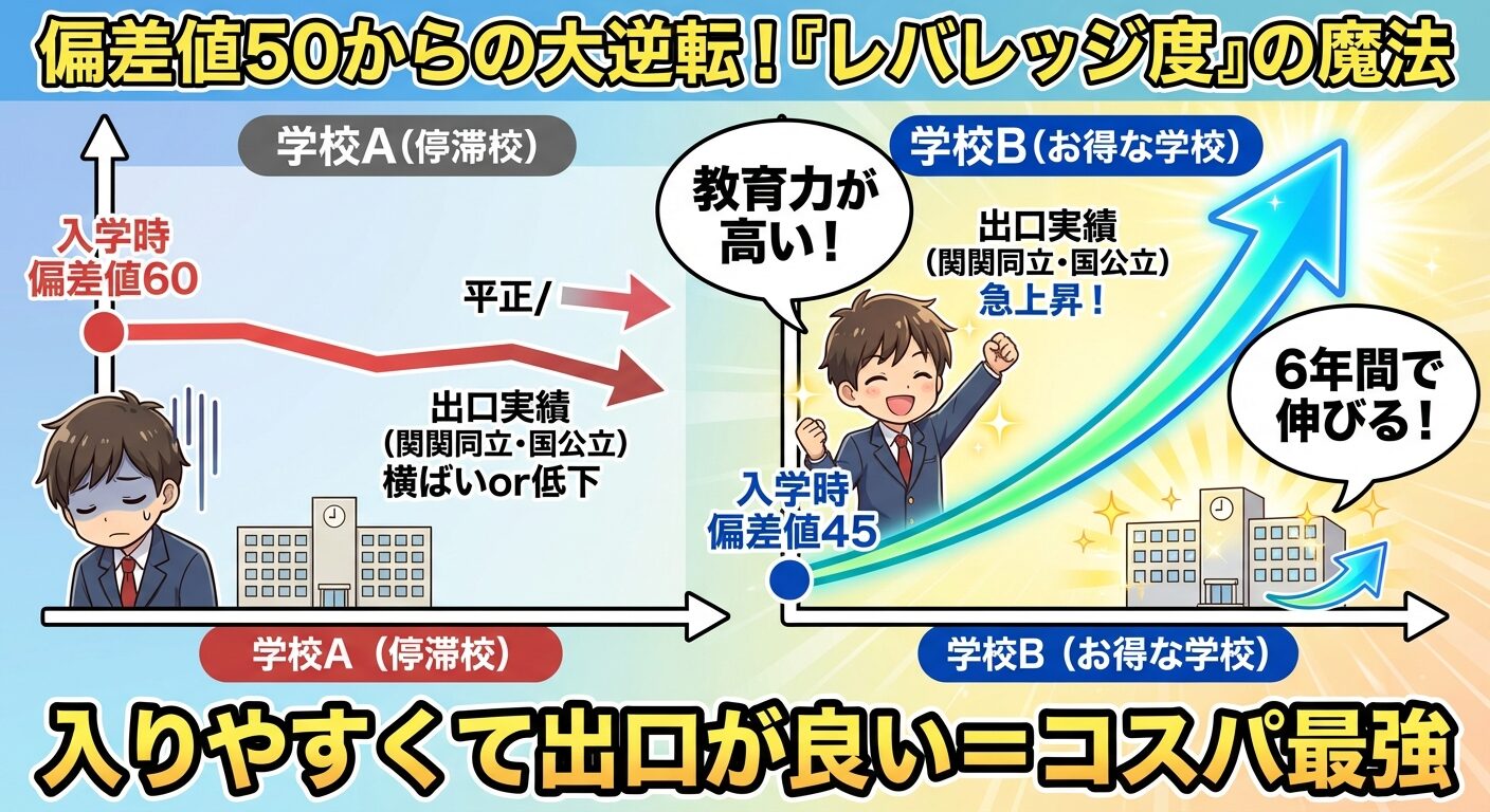 逆に、偏差値は高いのに、大学実績がパッとしない学校は「レバレッジが効いていない(伸ばせていない)」可能性があります。