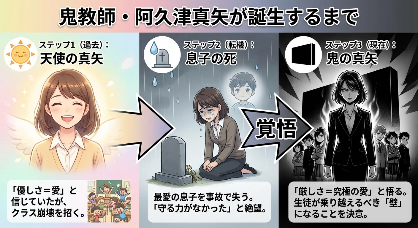 ここからは、阿久津真矢という教師が「鬼」へと変貌したプロセスと、その裏にある「息子の死」という悲劇的な因果関係について解説します。