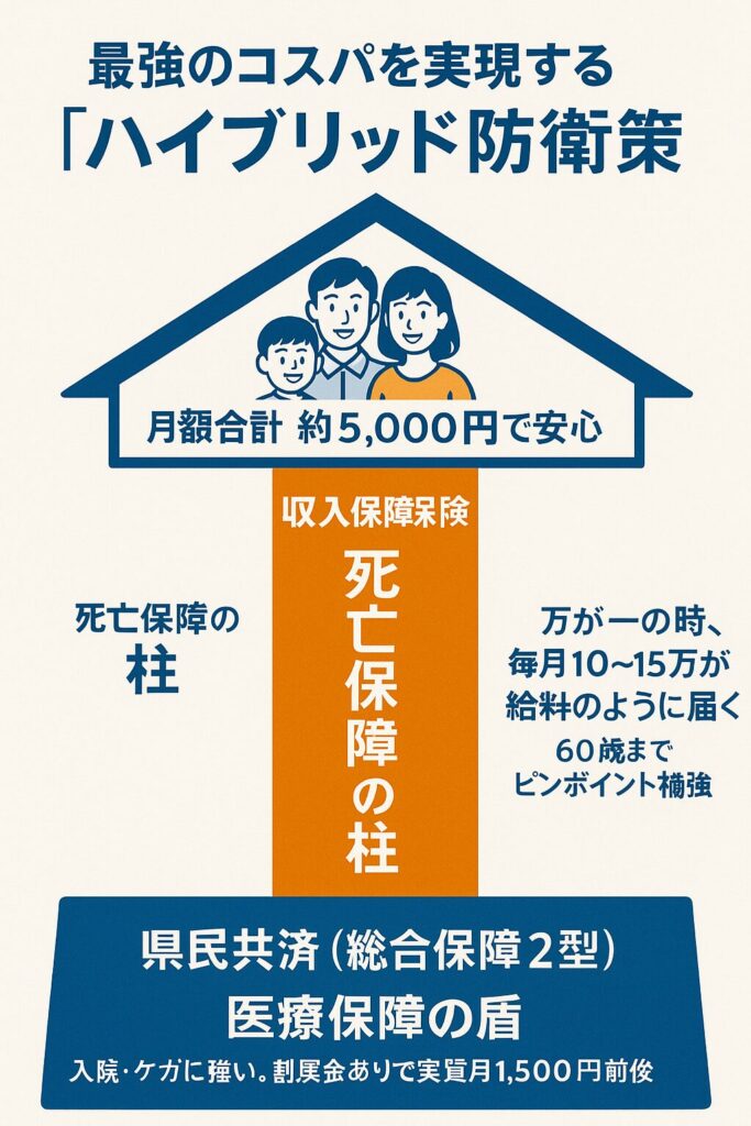 そこで私が提案するのが、県民共済を「土台」として残し、足りない死亡保障だけを「収入保障保険」という別の保険で補う「ハイブリッド戦略」です。