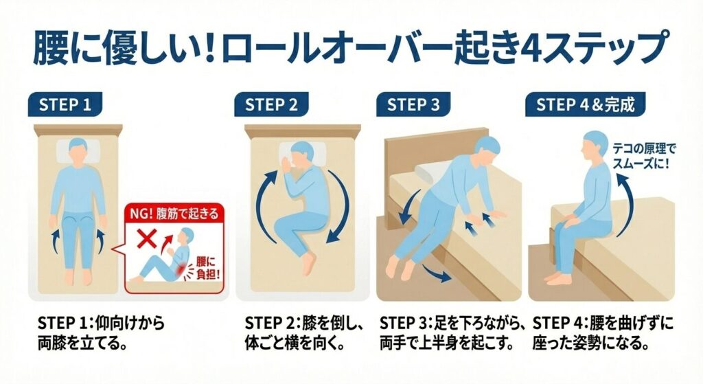 最後に、朝起きた瞬間の「ピキッ!」という激痛を防ぐための起き上がり方を伝授します。これは理学療法士も指導する「ロールオーバー法」という技術です。
