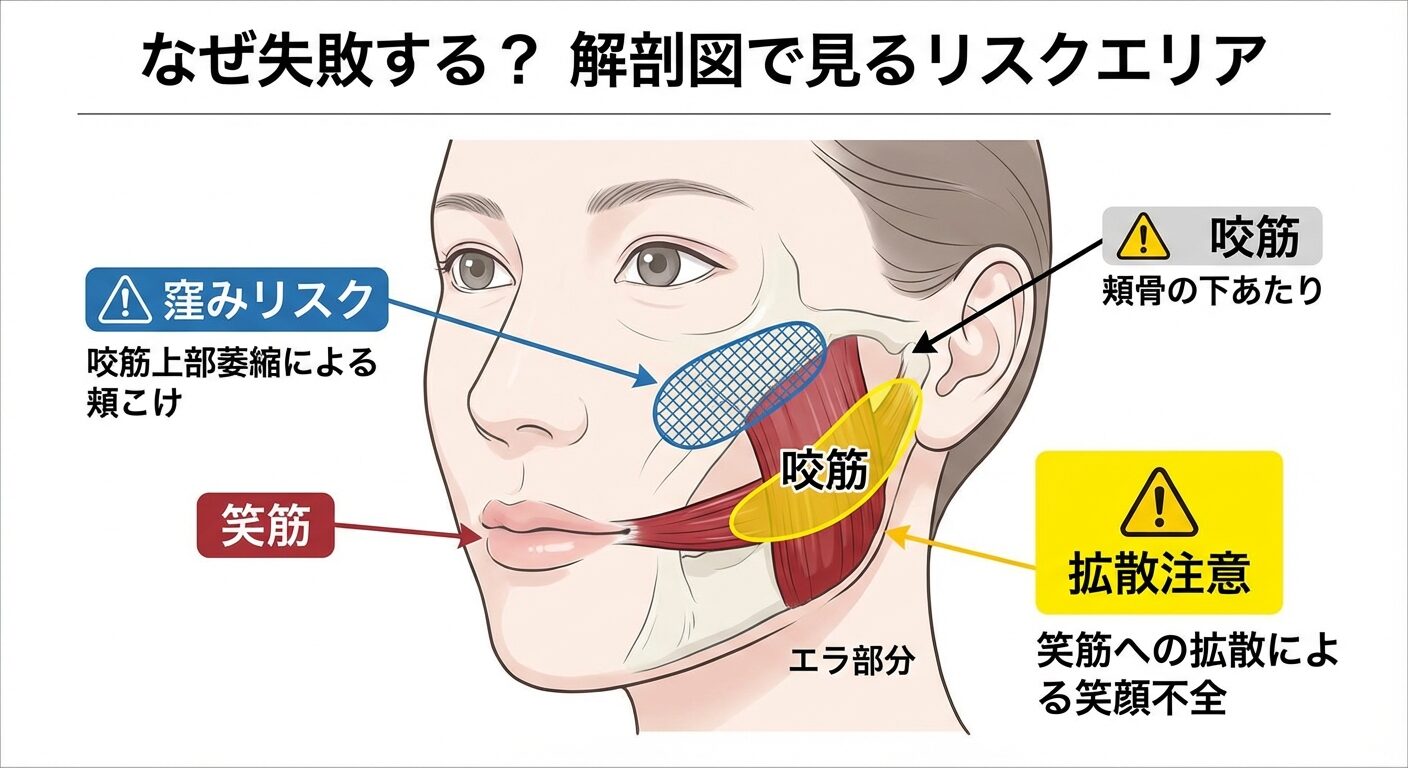 顔が変わってしまうリスク、絶対に避けたいですよね。でも、ボトックスの失敗は「運」ではありません。そこには明確な「解剖学的な理由」があります。