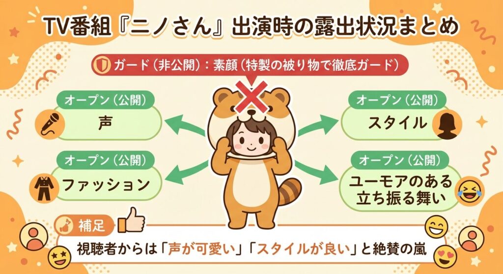 | TV出演時の姿 | 被り物を着用。声やスタイルは本物。 | 「放送事故で顔が出た」というデマ。 |