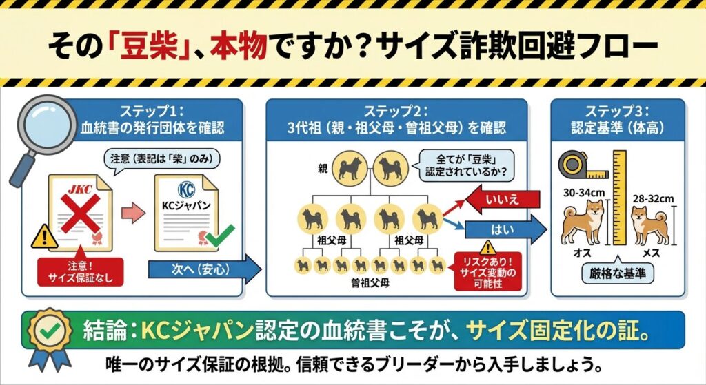 親犬が小さくても、祖父母が大きければ、隔世遺伝で突然大きくなることは珍しくありません。「親が小さいから大丈夫ですよ」という店員の言葉を鵜呑みにせず、必ず血統書と認定団体を確認してください。