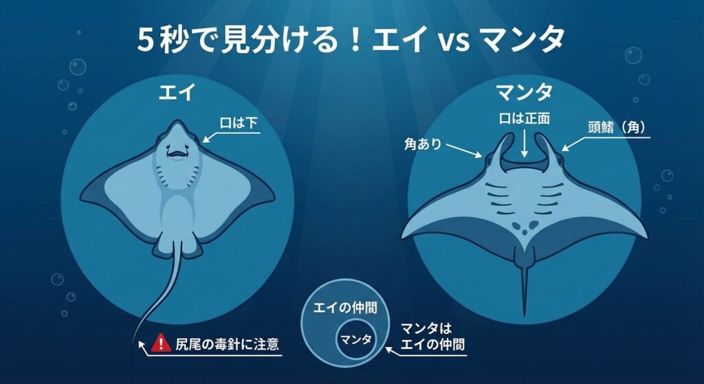 マンタの顔の左右には、プランクトンを効率よく口に追い込むための「角のようなヒレ」があります。これはマンタ特有の装備で、他のエイにはありません。 - 毒針の有無:尻尾に武器があるか