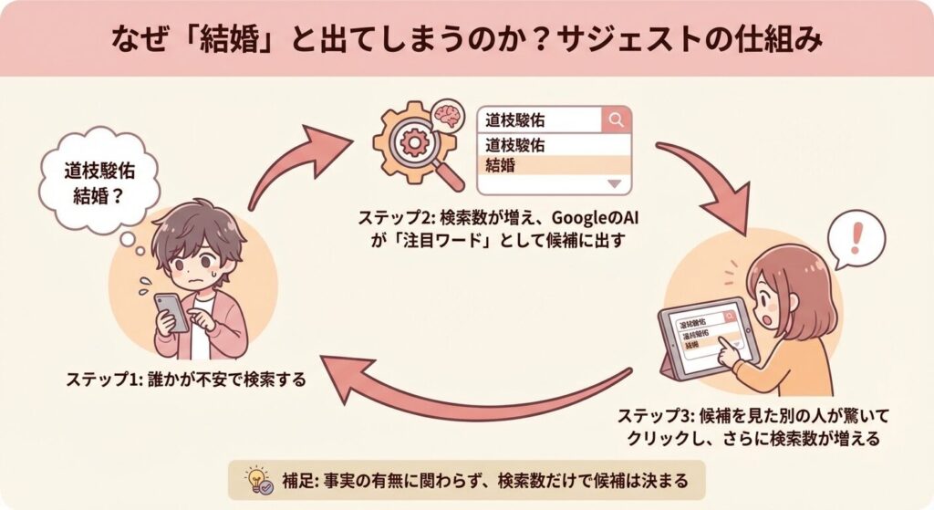 検索候補(サジェスト)は、事実があるから表示されるのではなく、「多くの人が気になって検索した言葉」が自動的に表示される仕組みです。道枝駿佑さんのような圧倒的な人気者は、少しドラマで共演しただけで「あんなに仲が良いなら、もしかして結婚するの?」と不安になったファンが検索を繰り返します。その結果、AIが「このワードは需要がある」と判断し、さらに目立つ場所に表示してしまうのです。