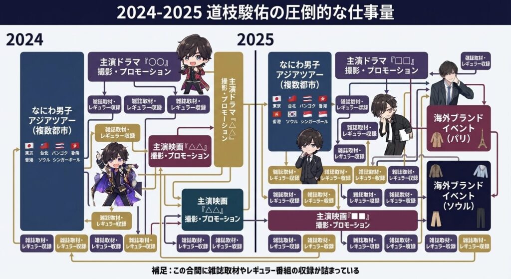 2024年から2025年にかけて、道枝駿佑さんの活動は日本国内に留まらず、アジア全域へと拡大しています。なにわ男子のアジアツアー、主演ドラマや映画の撮影、さらには数多くのブランドアンバサダーとしての海外公務。道枝駿佑さんの過密スケジュールとプライベートの時間は、完全な反比例の関係にあります。 週刊誌が24時間体制でマークしていても、密会どころか「寝る時間があるのか」と心配されるほどの仕事量なのです。