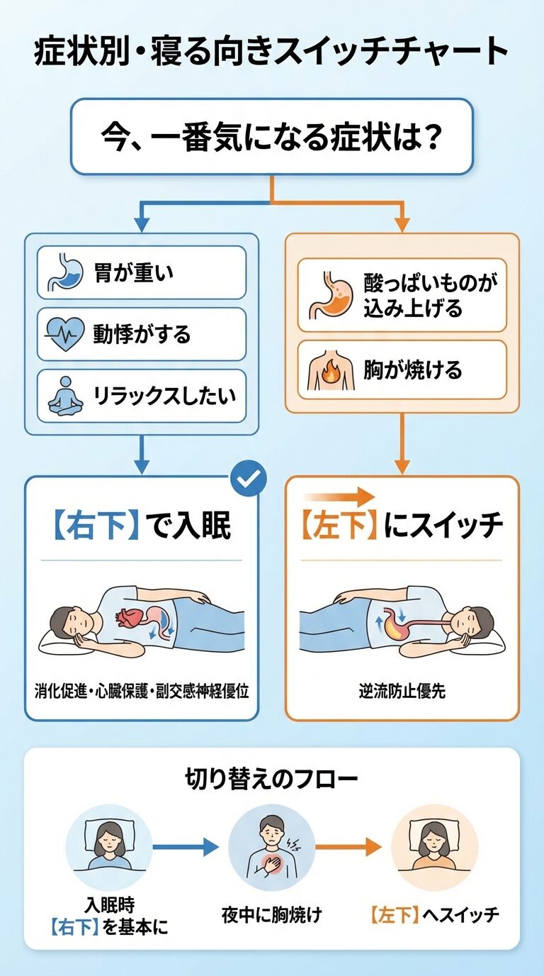 結論からお伝えします。心臓への負担を減らし、消化を助けたいなら「右下」が基本です。しかし、胸焼け(逆流感)がある時だけは「左下」が正解になります。