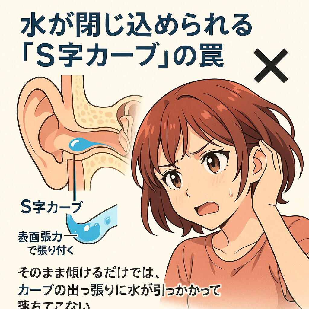 つまり、外耳道がS字に曲がっているため、単に頭を傾けてジャンプするだけでは、水がカーブに引っかかって出口まで辿り着けないのです。さらに表面張力が糊(のり)のように作用し、水をその場に留めてしまいます。